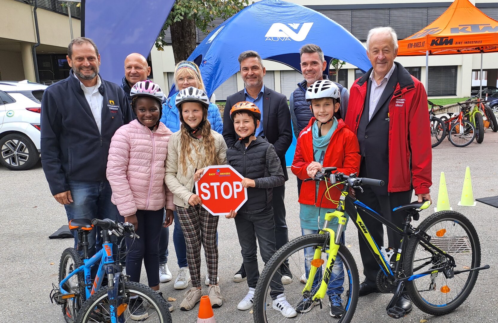 Bürgermeister Markus Lakounigg, Rudolf Schober mit Anton Podbevsek und Peter Plaimer, Vertreter des Kärntner Zivilschutzverbandes, VS Direktor Norbert Haimburger, Markus Lippitsch AUVA und die Klassenlehrerin Sieglinde Kuester waren von der professionellen Begleitung der Workshops durch das Team von Easy Drivers begeistert. Und für die Schülerinnen und Schüler der 4a, 4b und 4c war es eine willkommene Abwechslung des neuen Schulalltages!