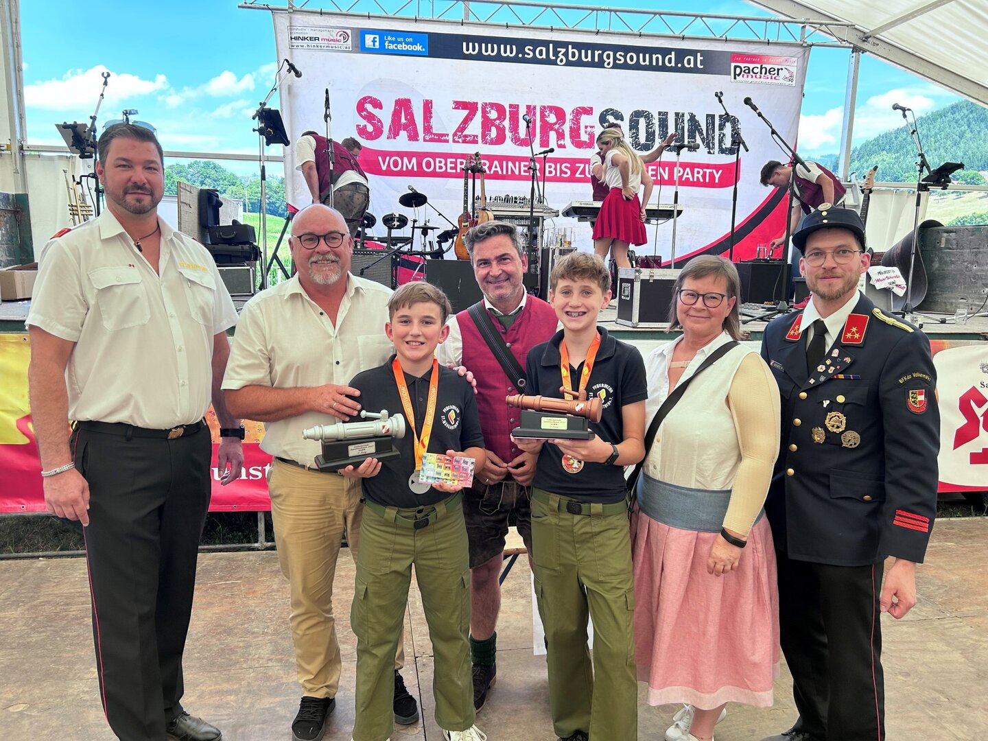 Bei passendem „Zeltfestwetter“ genossen die vielen Gäste die kulinarischen Köstlichkeiten und die stimmungsvolle Musik von „Salzburg Sound“. Besondere Ehrung erhielten bei dieser Gelegenheit die Mitglieder der Jugendfeuerwehr Franzi und Fabio, die bei der Landesmeisterschaft im „Einzelbewerb Silber“ den 2. und 3. Platz und somit in dieser Klasse das silberne und bronzene Strahlrohr nach St. Margarethen o. T. holen konnten. Recht herzlich dazu gratulierten auch Bürgermeister Markus Lakounigg, Stadtrat Gerald Grebenjak und Gemeinderätin Trixi Stornig.