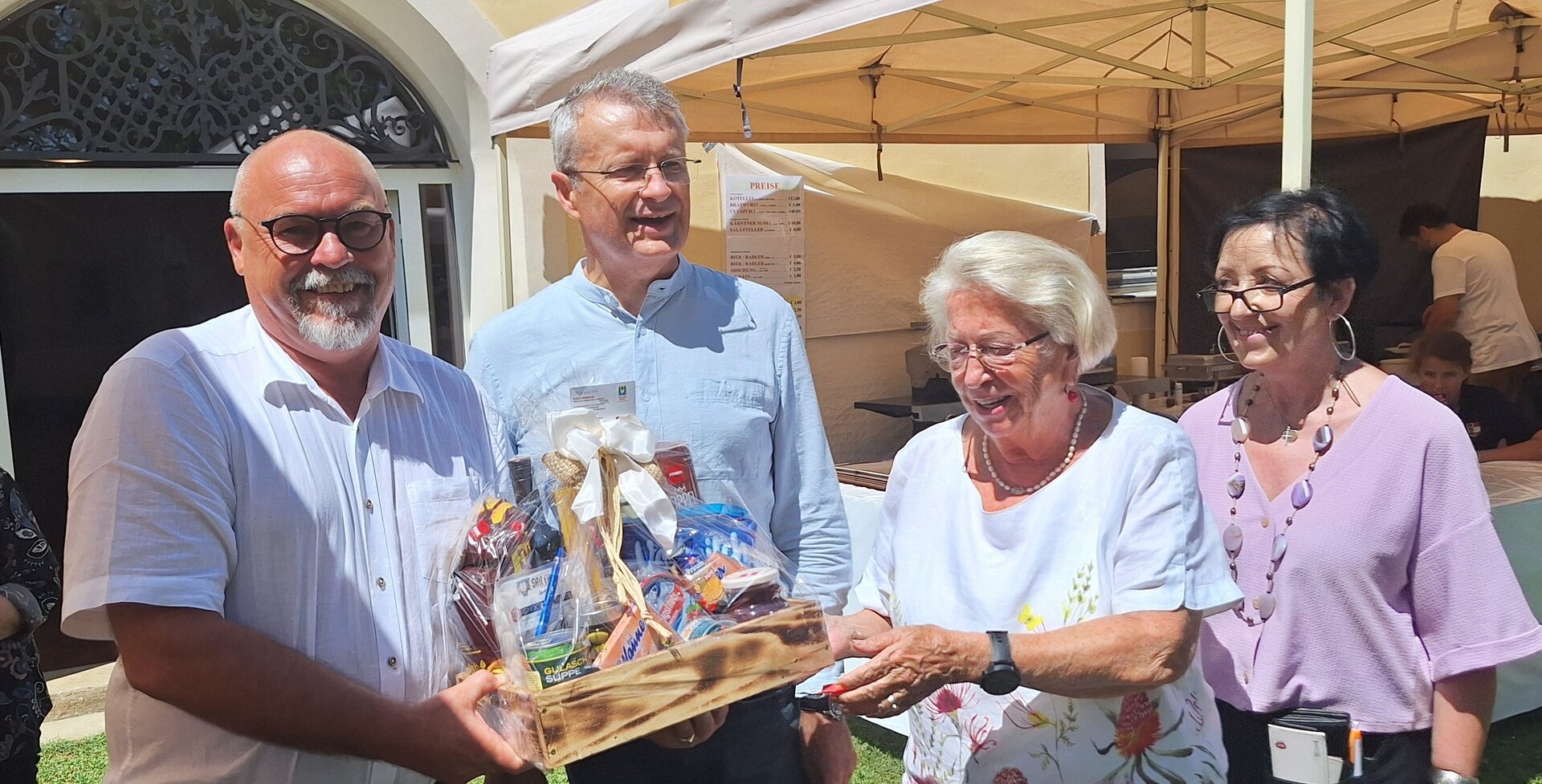 Anschließend trafen sich die Gäste zu einem gemütlichen Beisammensein im Garten des Pfarrhofes. Neben den kulinarischen Köstlichkeiten und einer Hupfburg für die Kinder begeisterte auch der große Glückshafen mit Preisen aus der Region die Gäste. Unter den vielen Gästen waren auch Vbgm Mag Peter Wedenig, StR Gerald Grebenjak und StR Elisabeth Kollitsch. Einen der Hauptpreise konnte Annemarie Gril gewinnen, der ihr von Gerald Grebenjak und Dechant Zoltan Papp übergeben wurde.