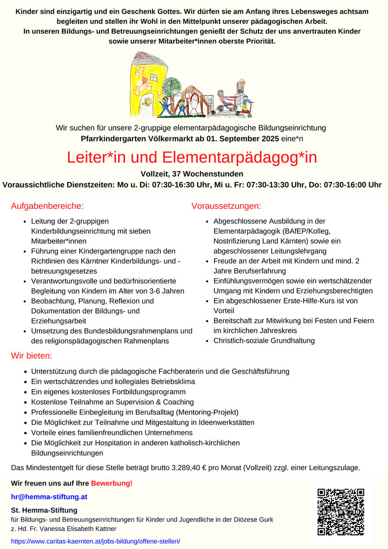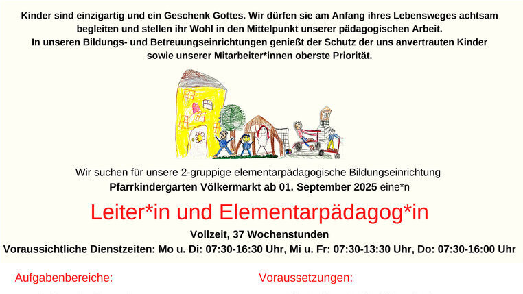 Stellenausschreibung Pfarrkindergarten Völkermarkt: Leiter*in und Elementarpädagog*in (pdf)