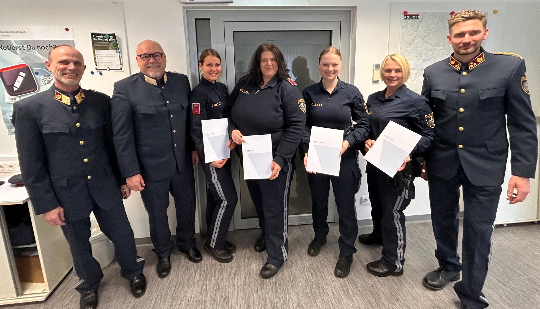 Von der Polizeiinspektion Völkermarkt wurde GrInsp Susanne Pitschko für 30 Jahre Exekutivdienst ausgezeichnet, sowie wurden Elisabeth Krall, B.A., Emily Lakounigg, Laura Nerz, Kathrin Werkl und Mag Anita Zimmermann die Dekrete anlässlich der Ernennung zu Inspektoren übergeben. Bezirkspolizeikommandant Obstl Klaus Innerwinkler und auch Polizeiinspektionskommandant ChefInsp Gerald Grebenjak gratulierten recht herzlich und hoben die Bedeutung des Nachwuchses in der Polizei hervor. Besonders war auch, dass gleichzeitig mit der Ernennung von Insp Kathrin Werkl ihre Mutter, GrInsp Cornelia Werkl der Polizeiinspektion Grablach, für 30 Jahre Exekutivdienst ausgezeichnet wurde.